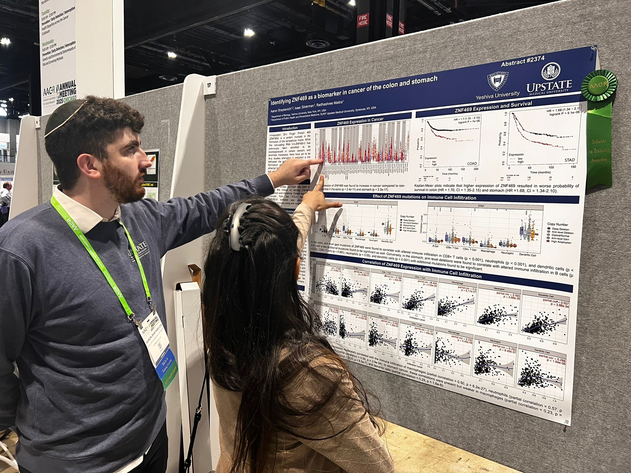 This year, Shaykevich was awarded the AACR Scholar-in-Training award for his research with Dr. Maitra, a professor of biology at Yeshiva College. The AACR Scholar-in-Training award is highly competitive and recognizes outstanding young investigators, including graduate students, residents, and clinical and postdoctoral fellows presenting meritorious abstracts at the AACR Annual Meeting. Shaykevich received the award for his abstract titled Identifying ZNF469 as a biomarker in Cancer of the Colon and Stomach. His award was funded by Debbie’s Dream Foundation, a non-profit organization dedicated to raising awareness about stomach cancer that has partnered with the American Association for Cancer Research to allocate more than $2,000,000 in funding to talented, motivated scientists across the country through its Research Grants program.